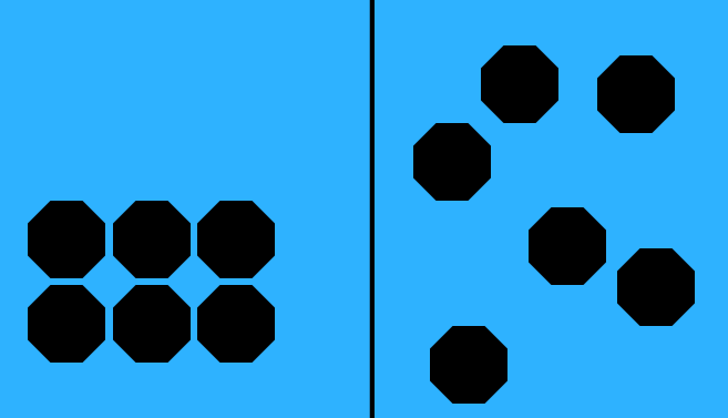 En el siguiente ejemplo, se puede ver cómo el cambio de espacio y de agrupación de los elementos crea una sensación completamente diferente en la composición. A la izquierda, el espacio uniforme entre los elementos crea una sensación de orden y seguridad. A la derecha, los distintos espacios entre los elementos crean una sensación de desorden y confusión.