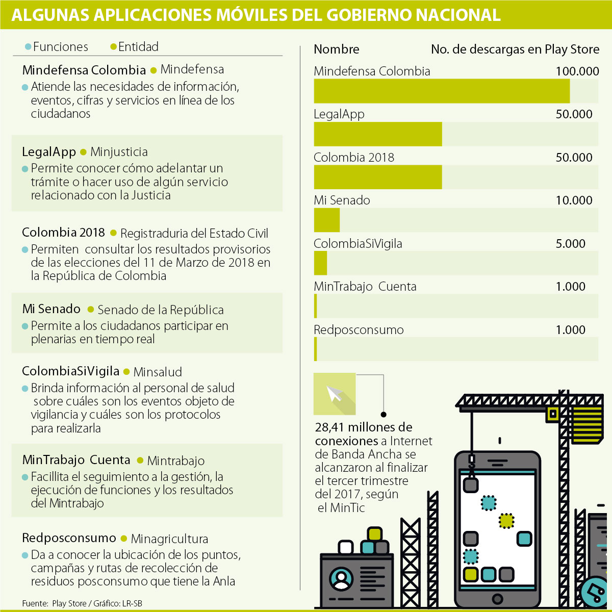 Según el más reciente reporte del MinTIC al finalizar el tercer trimestre de 2017, el país alcanzó un total de 28,41 millones de conexiones a Internet de Banda Ancha, de las cuales, 15,8 millones se realizaron mediante en redes fijas y móviles.