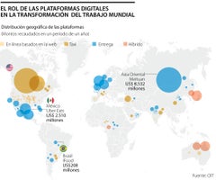 De acuerdo con las más recientes estimaciones de la Organización Internacional del Trabajo (OIT) en su informe ‘Perspectivas Sociales y del Empleo en el Mundo: El papel de las plataformas digitales en la transformación del mundo del trabajo’, alrededor del planeta hay 338 plataformas dedicadas a las entregas o domicilios, 283 destinadas a servicios en la red, 106 que prestan servicios de transporte y cinco grandes compañías híbridas que prestan uno o más de estos servicios.