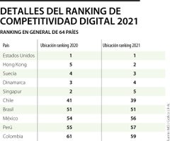 El Instituto Internacional para el Desarrollo Gerencial, IMD, reveló que Colombia mejoró dos puestos en el ranking de competitividad digital que mide la capacidad y disposición de 64 principales economías del mundo para adaptar y explorar tecnologías digitales como un motor clave para la transformación económica.